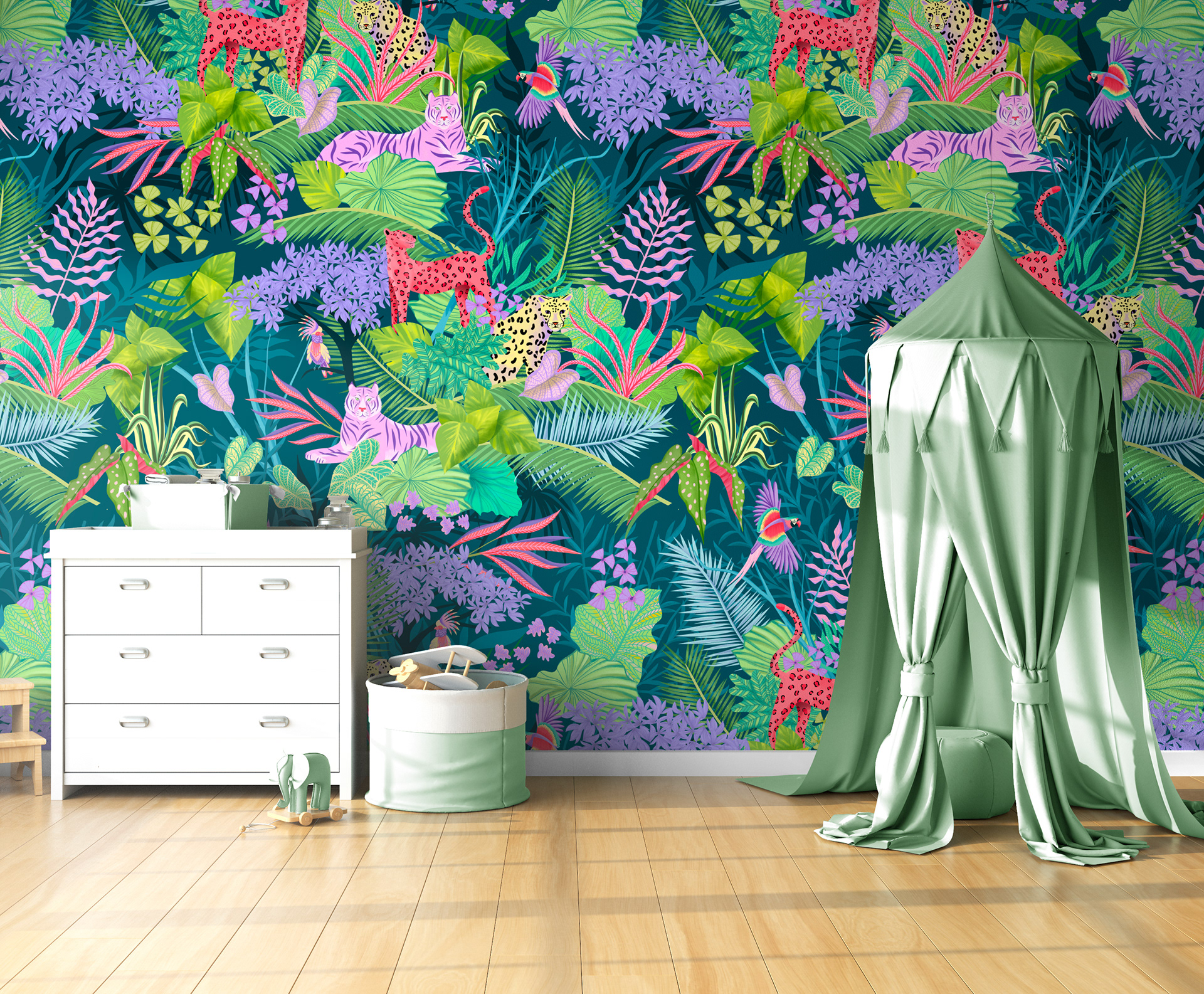 Conçu pour se décliner facilement, Pop Jungle s’adapte à de nombreux supports : textile, papeterie ou objets de décoration, notamment pour l’univers de l’enfant, où il insuffle une énergie ludique et colorée.