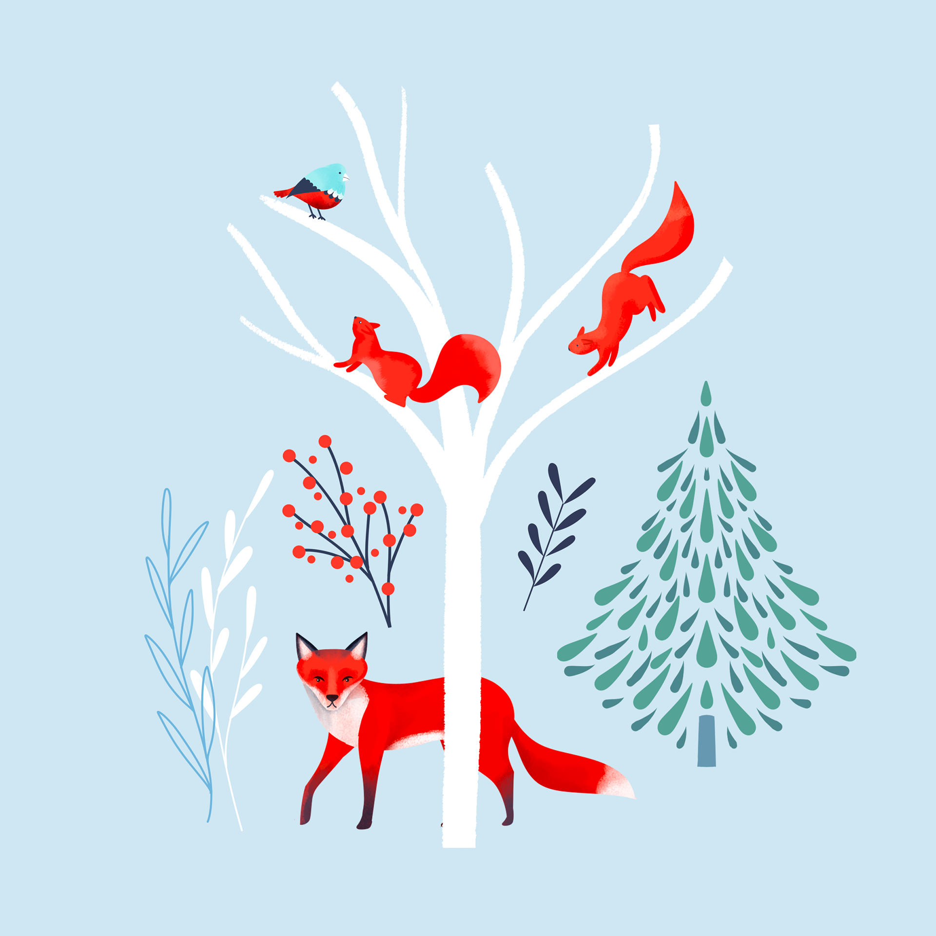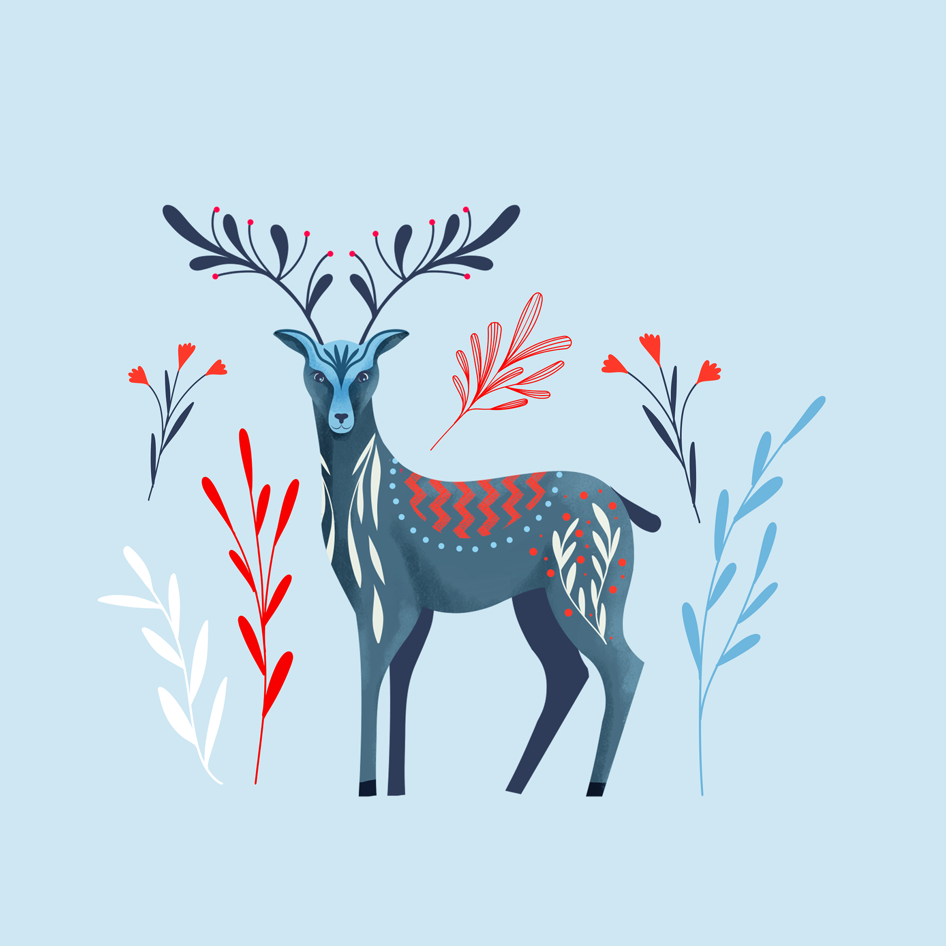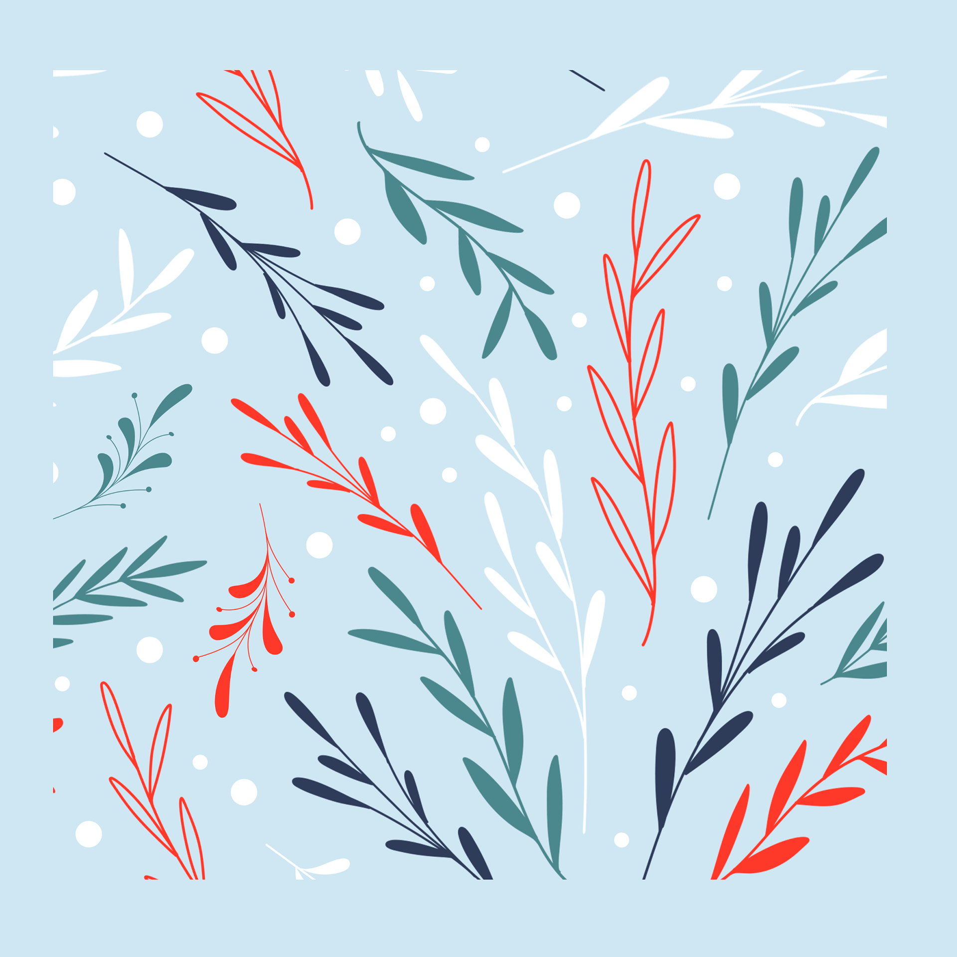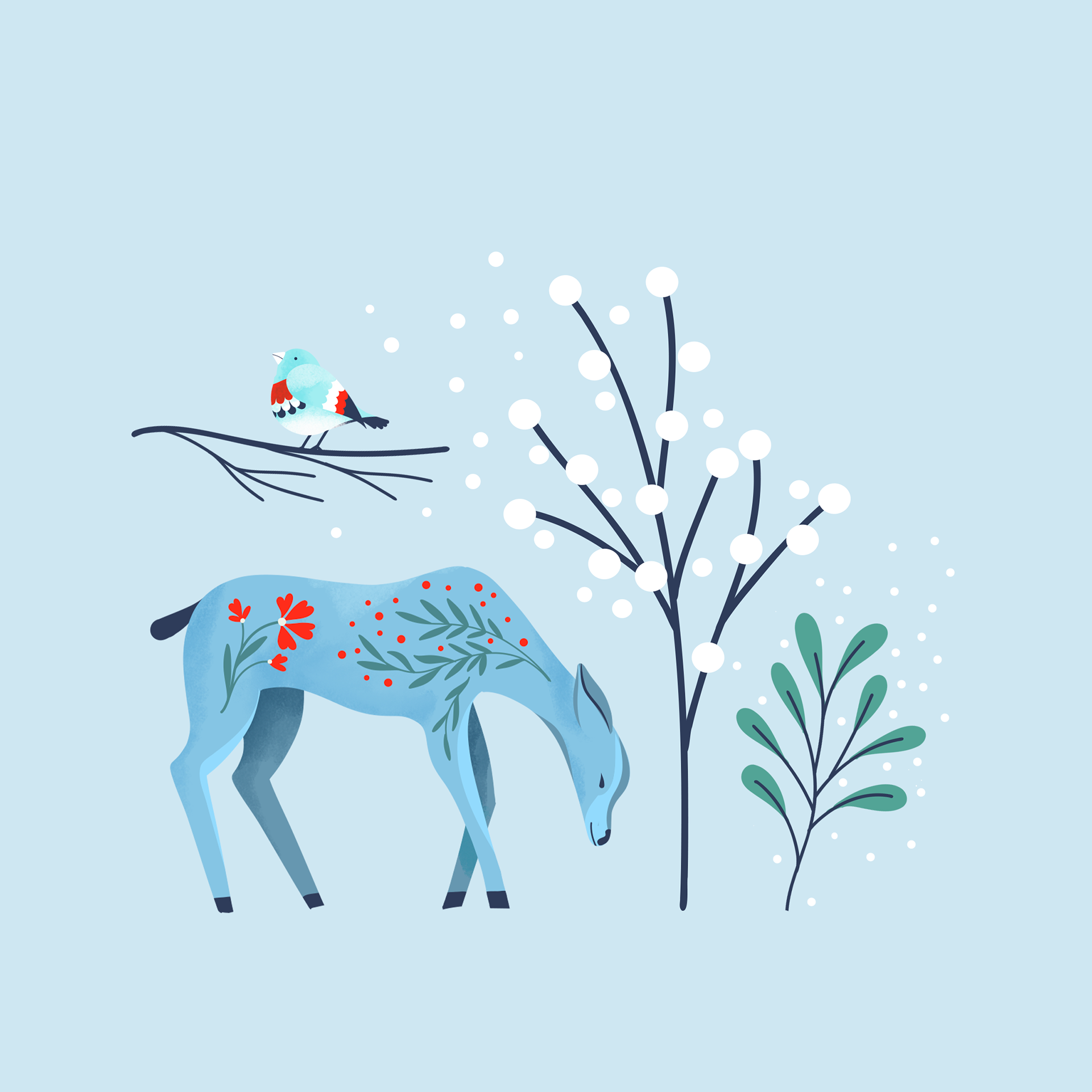 Un motif hivernal inspiré des balades silencieuses en forêt, où les animaux surgissent entre les branches givrées. Cerfs, renards et oiseaux se mêlent à une végétation stylisée dans une palette douce ponctuée de touches vives. Un pattern narratif et décoratif, pensé pour créer une atmosphère apaisante, chaleureuse… même au cœur de l’hiver.